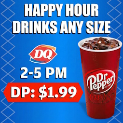 Come by and enjoy a refreshing DQ drink for only $1.89 from 7AM – 10AM and from 2PM – 5PM. It’s the refreshing way to fuel your day! You don’t want to miss a deal like this!